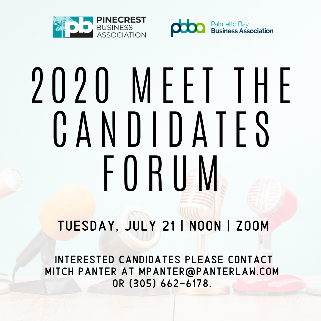 Llamado a todos los candidatos que se postulan para la Junta Escolar, el Consejo, la Judicatura o la Alcaldía que representan a Pinecrest o Palmetto Bay... ¡queremos saber de ustedes! El martes 21 de julio, la Asociación Empresarial de Pinecrest y la Asociación Empresarial de Palmetto Bay organizarán un foro conjunto “Conozca a los candidatos” en Zoom al mediodía. Moderado por Mitch Panter, socio gerente de Panter, Panter & Sampedro, los candidatos tendrán dos minutos para dirigirse a los líderes empresariales y profesionales de South Dade. Los candidatos interesados en participar deben confirmar su asistencia a Mitch en mpanter@panterlaw.com o al (305) 662-6178 a más tardar el 14 de julio. Reserve la fecha y esté atento a la información de inscripción de la PBA y PBBA. |